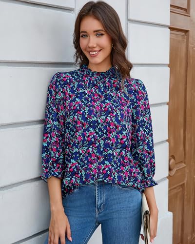 SimpleFun Womens Blouses 3/4 Sleeve Ruffle Neck Printed Business Casual Tops Flowy Dressy Work Shirts 1