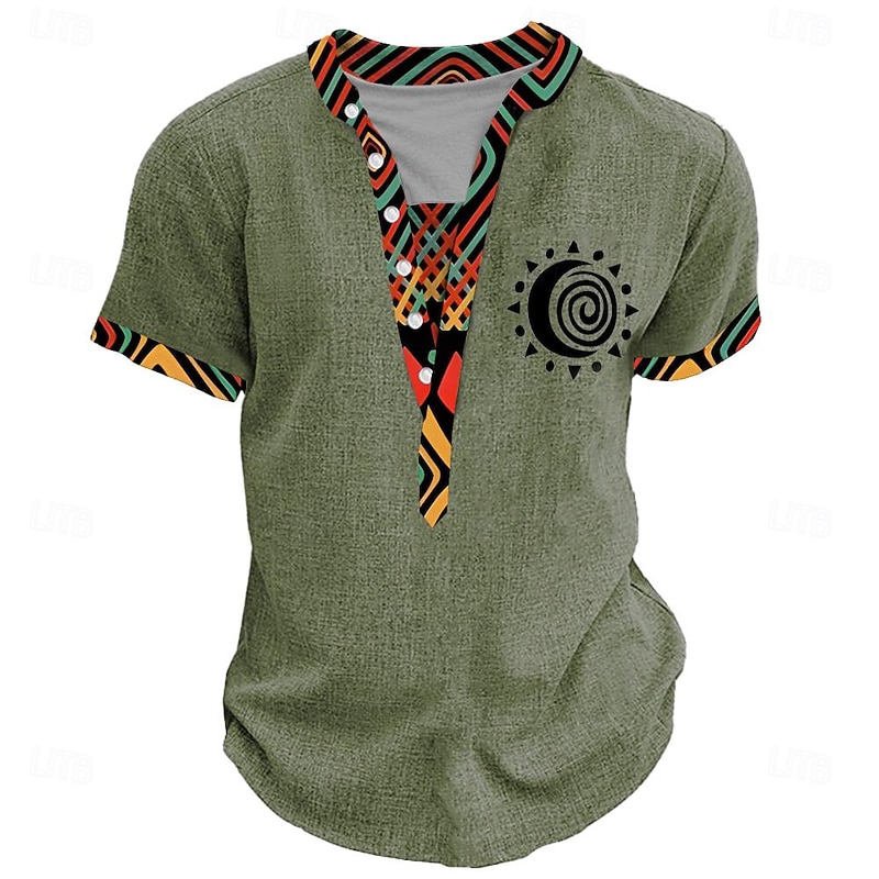 Highlights [Fabric] Made from high-quality polyester, this men's shirt is designed to be lightweight and breathable, making it perfect for the warm weather of spring and summer. The fabric offers a comfortable micro-elastic fit, ensuring ease of movement throughout the day. [Fit Type] The shirt features a regular fit, providing a relaxed yet stylish silhouette that caters to a range of body types, available in sizes S to 3XL. [Design Highlights] The standout design includes a Henley neckline with button-down details, accented by 3D tribal and bandana prints that add a touch of ethnic flair. The V-neck collar and vibrant geometric patterns on the placket and cuffs offer a lively, cultural aesthetic, while the artistic sun emblem on the left chest enhances the shirt's unique design. [Occasions] Ideal for vacations, holidays, daily activities, or casual outings, this shirt effortlessly combines comfort with distinctive ethnic style. It is versatile enough for everyday wear as well as special occasions, adding personality and charm to any outfit. [Size Range] Available in a range of sizes, from S to 3XL, and colors including Green, Yellow, and Khaki, this shirt caters to diverse style preferences and body measurements, ensuring a perfect fit for any fashion-forward individual.
