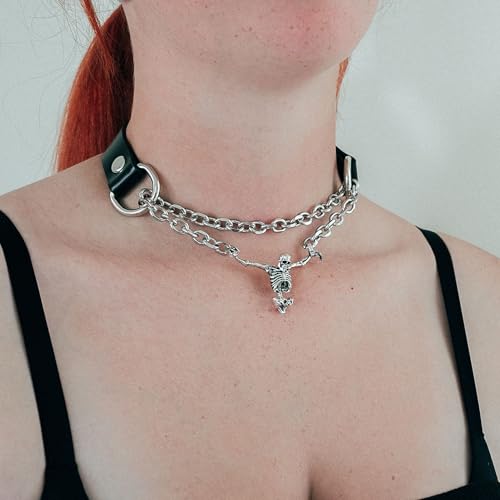 • PREMIUM QUALITY: Our skeleton slip chain necklace for women crafted from vegan leather with polished edges for a sleek, water-resistant finish. Combined with a stainless steel chain and a zinc alloy skeleton pendant, offering a striking statement piece.