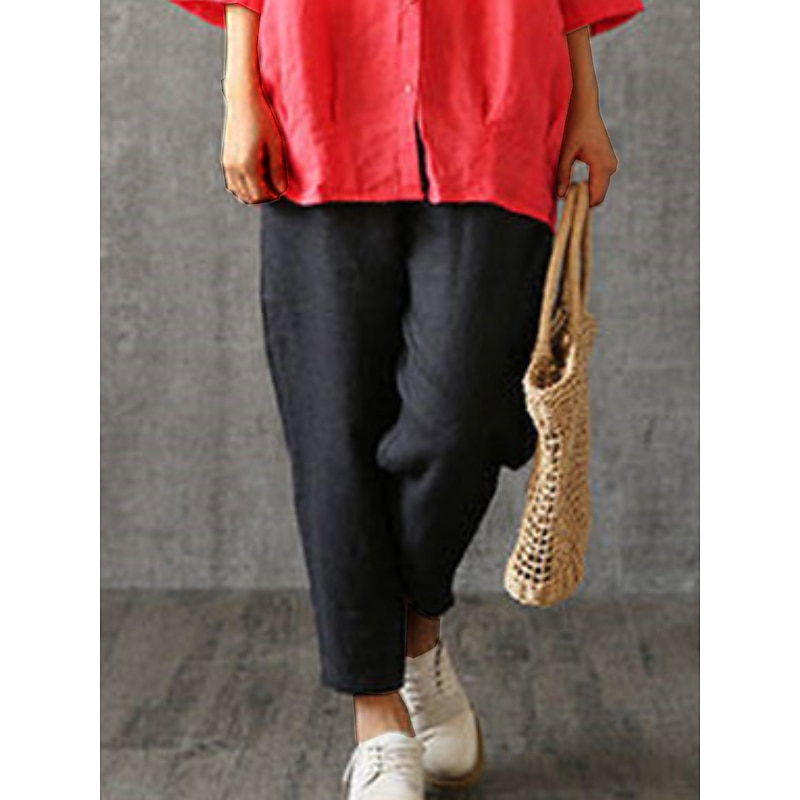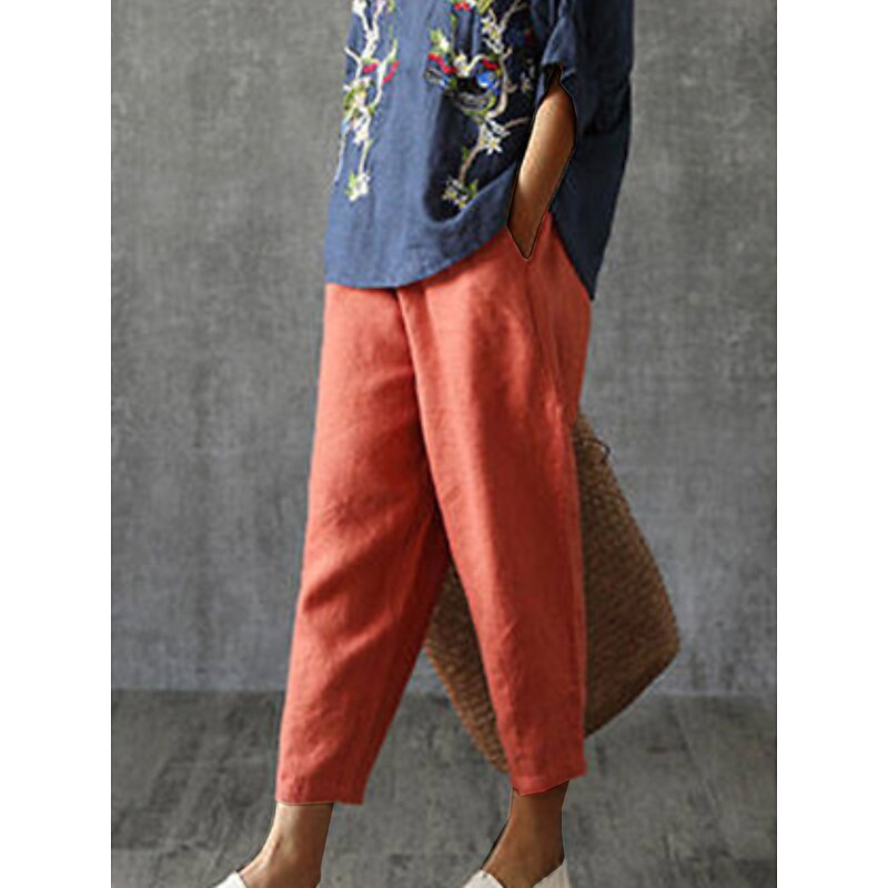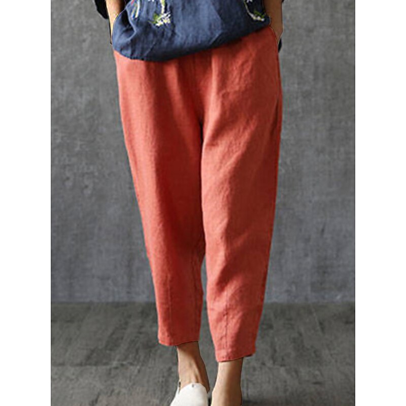 Highlights [Fabric]: Crafted from a premium linen-cotton blend, these women's pants offer the perfect balance of breathability and comfort, ideal for the warmer months of spring and summer. The combination ensures lightweight clothing that's soft against the skin, great for daily activities or leisurely outings. [Fit]: Designed with a relaxed, baggy silhouette and a slightly tapered ankle fit, these trousers provide freedom of movement while maintaining a fashionable outline. The mid-waist construction supports ease of wear and contributes to a chic, effortless look suited for both fashion-forward and laid-back lifestyles. [Design Highlights]: The minimalist design features convenient pockets and an elastic waistband for added comfort and functionality. The vibrant orange-red hue makes a bold statement, adding a pop of color to any wardrobe. Whether you're dressing up or keeping it casual, these pants offer versatile styling options. [Occasions]: Perfectly suited for daily wear, vacations, and casual outings, these pants adapt seamlessly to various occasions. Whether exploring the outdoors, headed out for a casual meet-up, or enjoying a leisurely day, they offer both style and functionality. [Sizes]: Available in a wide range of sizes from M to 4XL, these trousers cater to a variety of body types, ensuring a comfortable fit for all. Their versatility in size makes them a go-to item for many wardrobes.