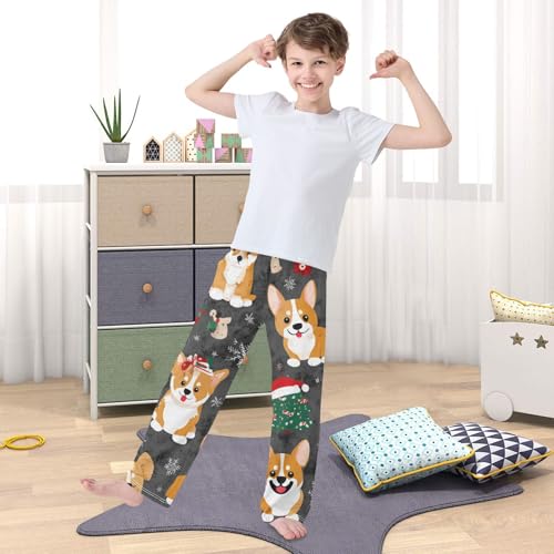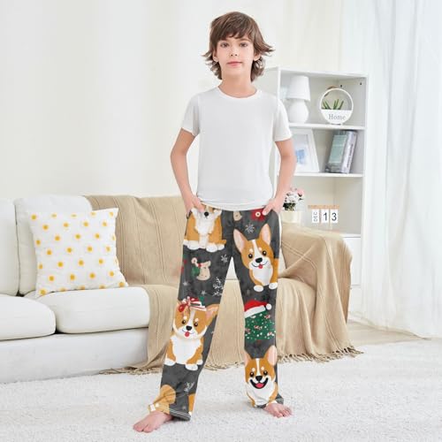 HOT ! Lovely Corgi Dog Christmas Snow Boys Long Pants Soft Trousers Elastic Waist Kids Lounge Bottoms with Pockets S-XL