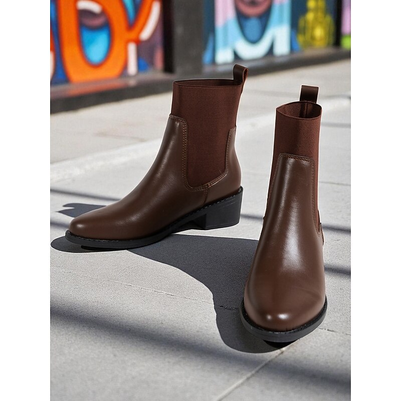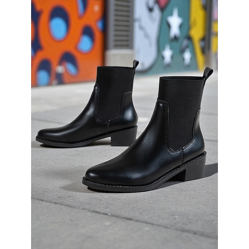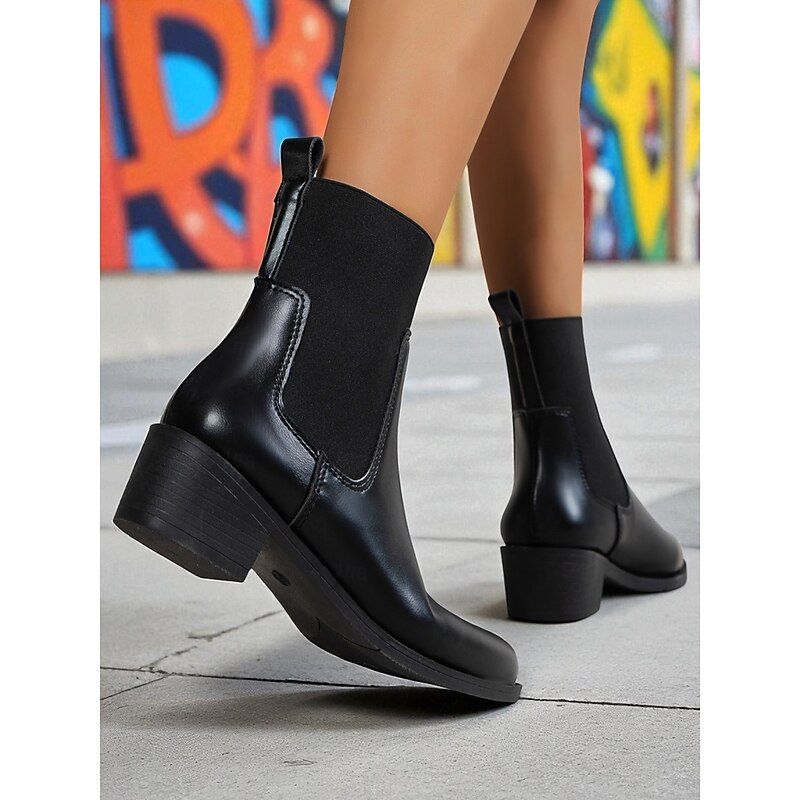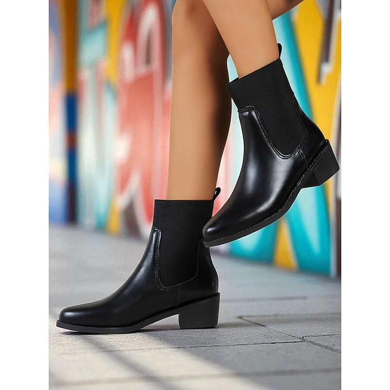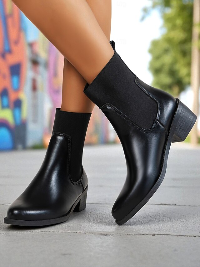 HOT ! Women's Black Faux Leather Chelsea Ankle Boots - Elastic Slip-On Low Heel Booties for Daily Commuting, Fall Outfits and Urban Casual Wear