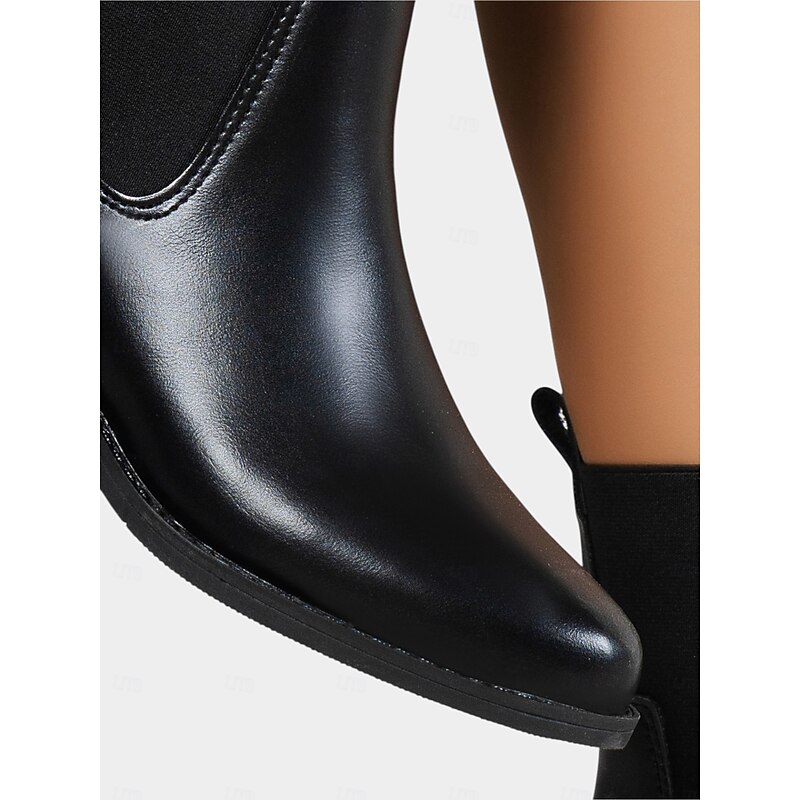 Women's Black Faux Leather Chelsea Ankle Boots - Elastic Slip-On Low Heel Booties for Daily Commuting, Fall Outfits and Urban Casual Wear 4
