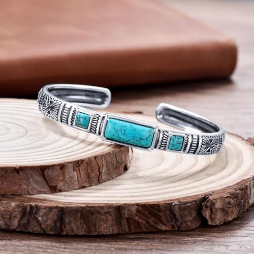 • This turquoise bangle makes for fine hypoallergenic skin-friendly silver, plated with precious rhodium for a long-lasting, lustrous finish. Cuff Adjustable Designed, fit for 6 6.5 7 7.5 inches, Turqupise Stone Size: 16*7mm+5mm*2