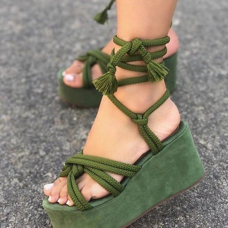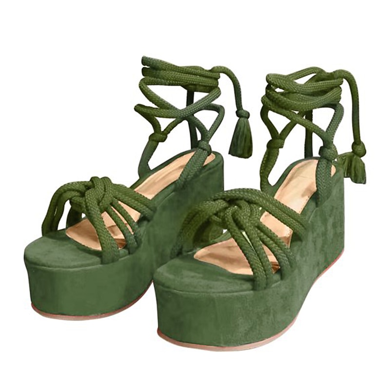 Highlights [Fabric] : Crafted from high-quality synthetics with a suede-like finish, these women's sandals offer a soft, comfortable feel while maintaining a sophisticated and earthy look. The materials ensure long-lasting wear and a stylish appearance suitable for various occasions. [Style and Fit] : These sandals feature a chic wedge and platform heel design that provides additional height without compromising comfort. The crisscross rope-like straps securely wrap the foot, ensuring both a secure fit and an elegant, trendy look. [Design Highlights] : The sandals boast a fashionable lace-up style with decorative tassels at the ankle, adding a touch of charm and uniqueness. The open toe and round toe design enhance breathability and comfort, perfect for warm-weather outings. [Occasions] : Ideal for everyday wear, outdoor adventures, beach walks, or even a casual day at the office, these sandals effortlessly combine comfort and trendiness. Whether it's a casual stroll or a summer event, these shoes make a versatile choice for any occasion. [Size Range] : Available in a range of sizes from 36 to 43, these sandals cater to a wide audience, ensuring a comfortable fit for women with various foot sizes. They offer a trendy option for those looking to stay stylish during the summer.