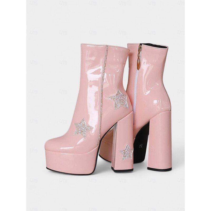 HOT ! Women's Black Patent Faux Leather Platform Disco Boots with Glitter Star Embellishments – 1980s Inspired Chunky Heels for Nightclub, Stage Shows and Y2K Fashion