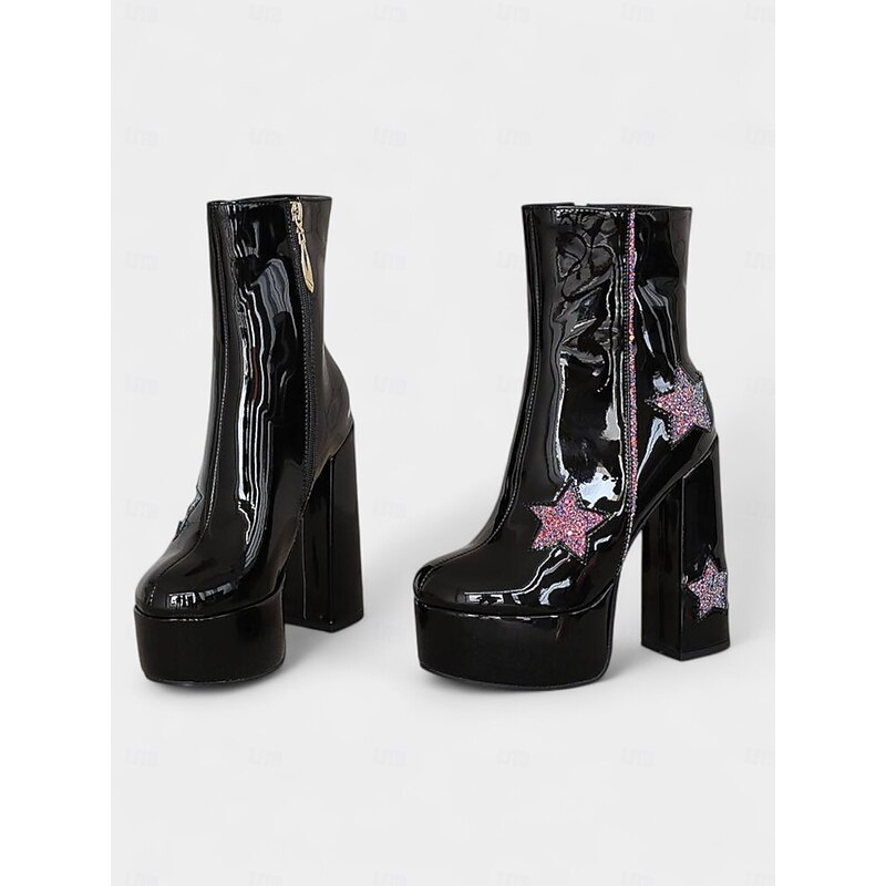 Women's Black Patent Faux Leather Platform Disco Boots with Glitter Star Embellishments – 1980s Inspired Chunky Heels for Nightclub, Stage Shows and Y2K Fashion 12