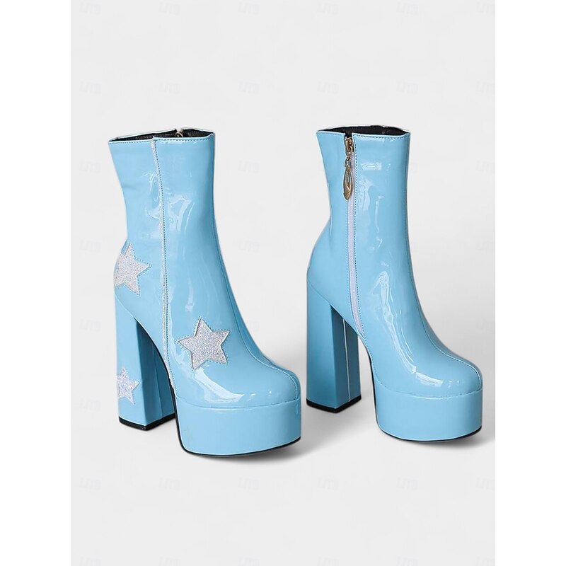 Women's Black Patent Faux Leather Platform Disco Boots with Glitter Star Embellishments – 1980s Inspired Chunky Heels for Nightclub, Stage Shows and Y2K Fashion 17