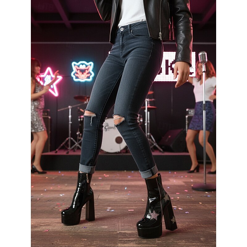 Women's Black Patent Faux Leather Platform Disco Boots with Glitter Star Embellishments – 1980s Inspired Chunky Heels for Nightclub, Stage Shows and Y2K Fashion 20