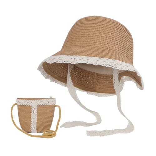 2pcs Girls Sun Hat with Shoulder Bag Set Large Brim Beach Straw Hat Purse UPF50+ Cute Lace Travel Party Summer Cap 2