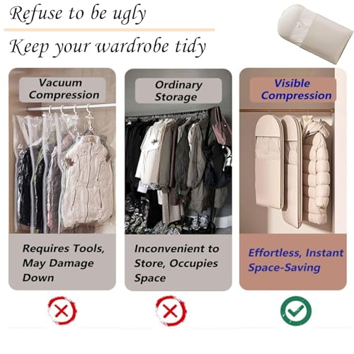 • 【Preserve Your Clothes' Perfect Form】 Unlike traditional vacuum storage bags that can flatten and deform fabrics, this hanging organizer with compression keeps down jackets fluffy and prevents fabric from warping. Your clothes will stay fresh, in great shape, and ready to wear whenever you need them.
