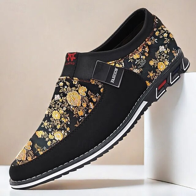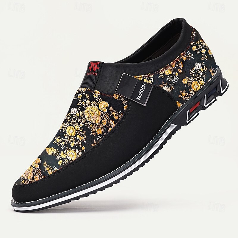 HOT ! Men's Black and Gold Floral Slip-On Sneakers – Trendy Jacquard Fabric Shoes for Casual Wear and Stylish Occasions