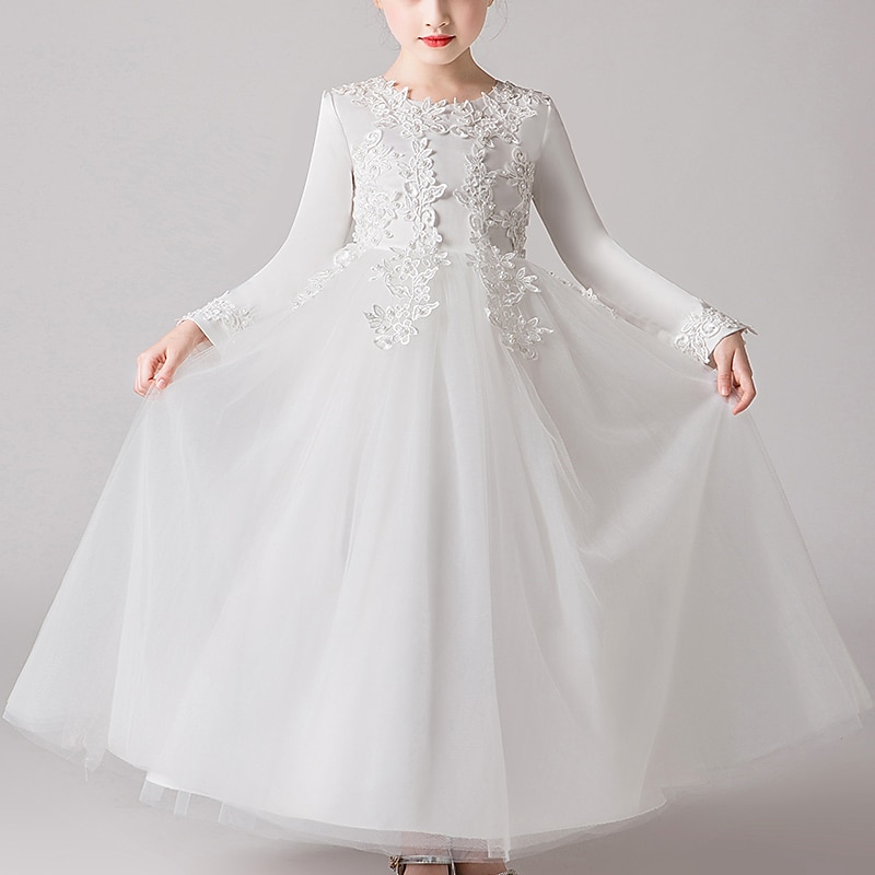 Flower Girl Dress Girls' Dress Princess Dress Party Dress Formal Wedding Party Elegant Cute Formal Children's Day Mesh Floral Long Sleeve Crew Neck Beige White 1