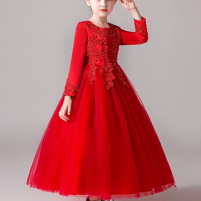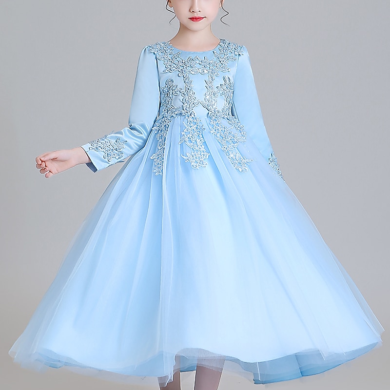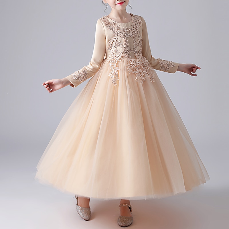 Flower Girl Dress Girls' Dress Princess Dress Party Dress Formal Wedding Party Elegant Cute Formal Children's Day Mesh Floral Long Sleeve Crew Neck Beige White 13