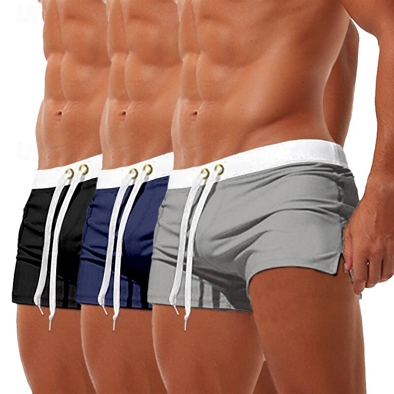 sought-after ! 3Pcs Men's Swim Trunks Swim Shorts Board Swim Briefs Elastic Waist Drawstring Zipper Pocket Solid Color swift Dry Breathable Short Casual Daily Beach Fashion timeless Style Black Micro-elastic