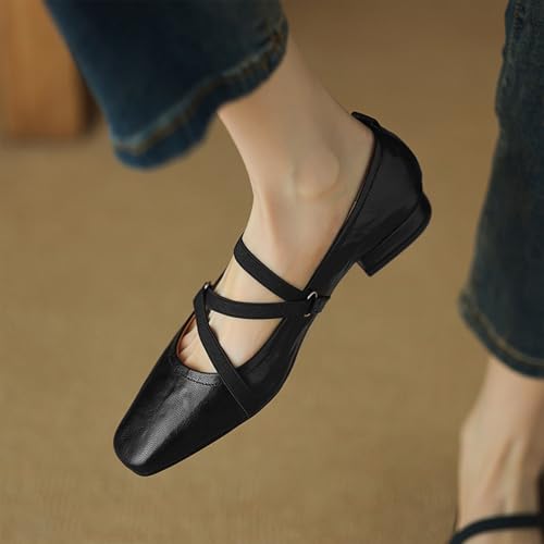 Women's Leather Low Block Heel Mary-Janes with Elastic Strap Vintage Square Toe Ballet Pumps Fashion Party Prom Dress Shoes 6