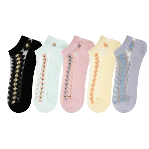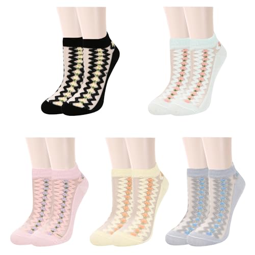 • 【SIZE & PACKING】 Medium Size. Fits for US Women Shoe Size 5-8. Each package contains 5 pairs of transparent sheer mesh ankle socks with different colors or patterns.