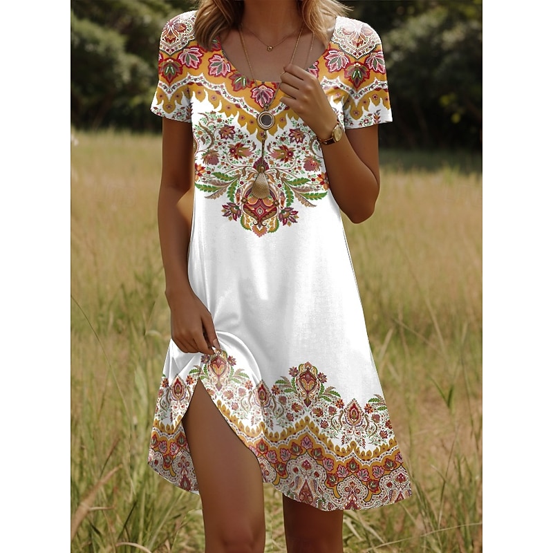 HOT ! Women's Mini Dress T Shirt Dress Tee Dress Sundress Vacation Casual Boho Going out Regular Fit Graphic Paisley Short Sleeve V Neck Yellow Red Blue Purple Summer
