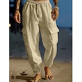 Men's Cargo Trousers Linen Pants Summer Pants Beach Pants Drawstring Elastic Waist Multi Pocket Plain Comfort Breathable Full Length Outdoor Daily Holiday Vacation Fashion Black White 12