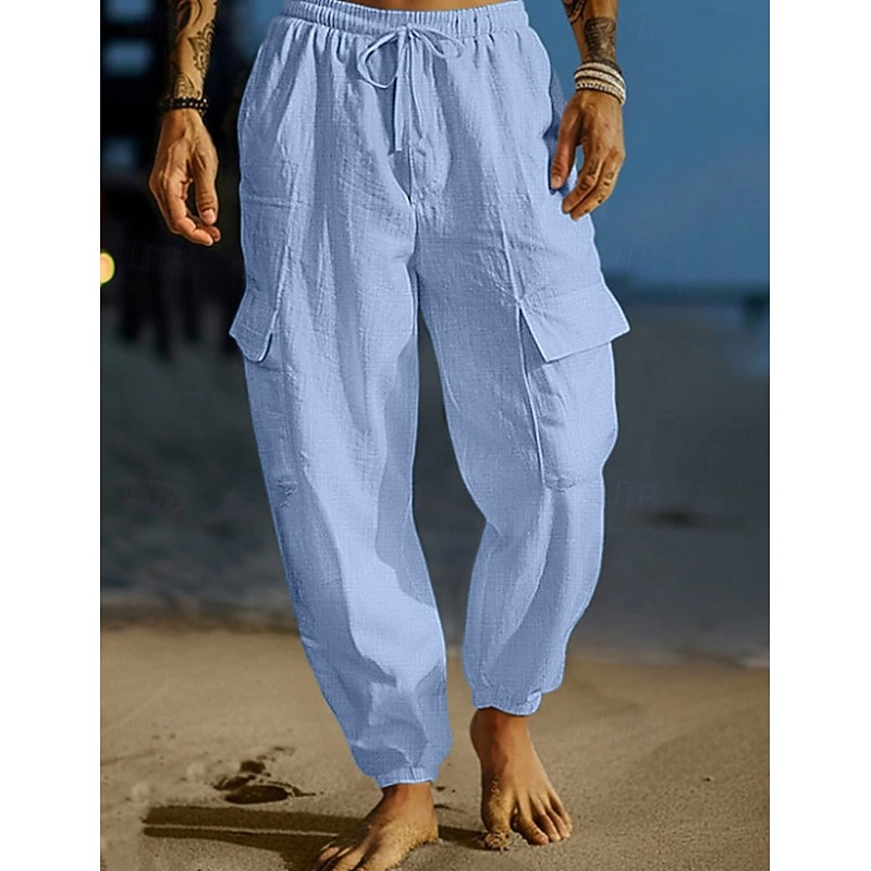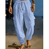 Men's Cargo Trousers Linen Pants Summer Pants Beach Pants Drawstring Elastic Waist Multi Pocket Plain Comfort Breathable Full Length Outdoor Daily Holiday Vacation Fashion Black White 10