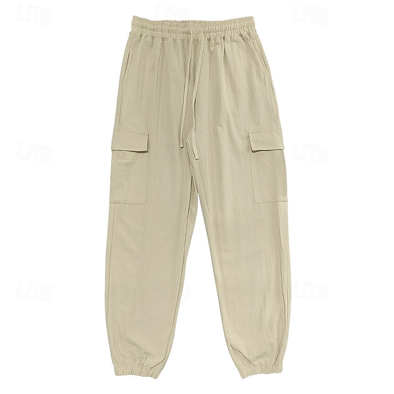 Men's Cargo Trousers Linen Pants Summer Pants Beach Pants Drawstring Elastic Waist Multi Pocket Plain Comfort Breathable Full Length Outdoor Daily Holiday Vacation Fashion Black White 11