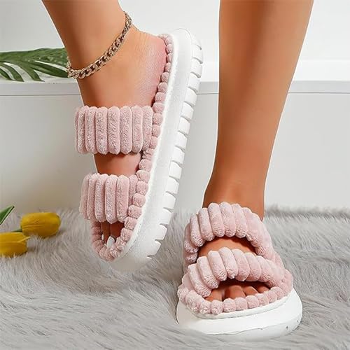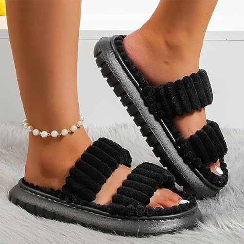 HOT ! Women's Minimalist Stripe Design Fuzzy Bedroom Slippers, Warm Fluffy Open Toe Slippers for Women, Double Strap Plush Slippers