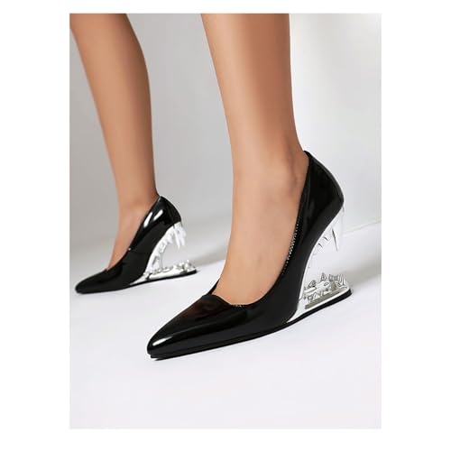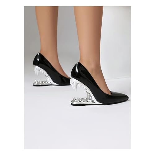 Women's Fashion Metallic Tiger Teeth High Heel Shoes Sexy Pointed Closed Toe Patent Leather Slip-On Shark Teeth Pumps