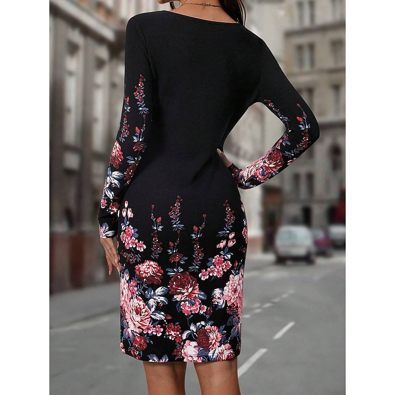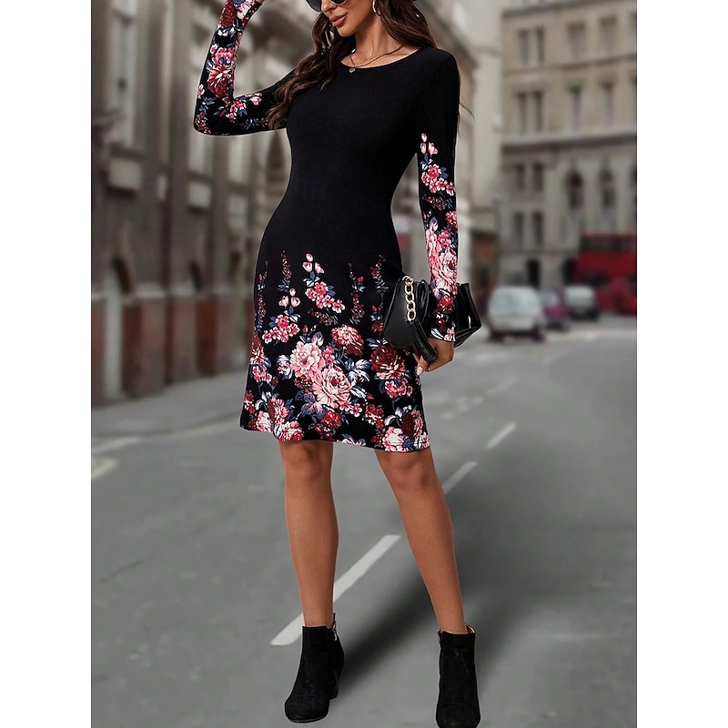 Highlights [Fabric] : Made from a comfortable and durable polyester blend, this dress offers micro-elasticity for ease of movement and a great fit, perfect for day-long wear during summer. [Silhouette] : The classic sheath silhouette enhances your figure with its tailored fit, providing a sleek and elegant look that transitions beautifully from casual to more upscale settings. [Design Highlights] : This dress showcases a vibrant floral print that stands out against a solid black backdrop, adding artistic flair and sophistication. The round crew neck creates a versatile base that pairs elegantly with accessories, while long sleeves provide a touch of formality suitable for any occasion. [Occasions] : Ideal for vacation getaways, daily outings, and semi-formal events, this dress exudes style and elegance, making it a versatile addition to your seasonal wardrobe. [Size Range] : Available in a range of sizes from S to 2XL, ensuring a fit that meets diverse body types and preferences, catering to a broad spectrum of style needs.