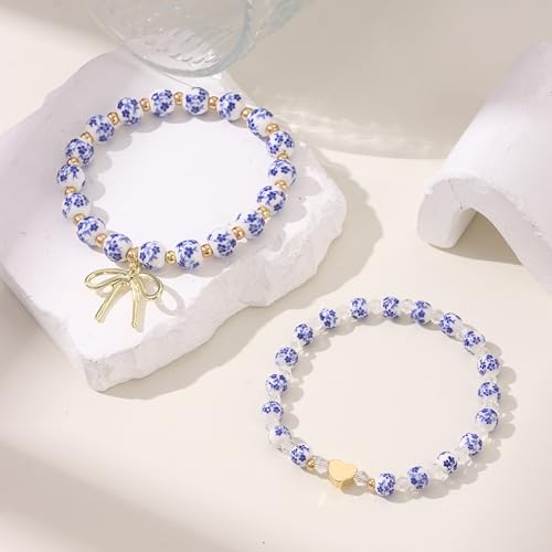 SAMOCO 2Pcs Bow Charm Beaded Bracelets for Women Blue/Pink Flower Vintage Bracelet Handmade Stretch Gold Beads Dainty Jewelry Gift 6