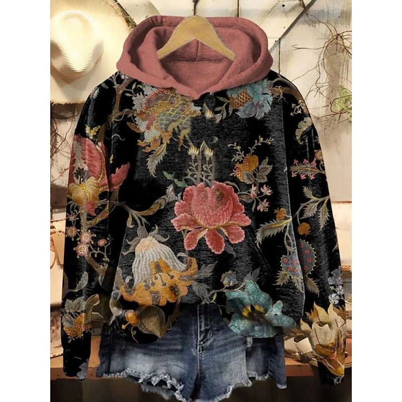 HOT ! Women's Pullover Hoodie Sweatshirt Floral Warm Vintage Western Long Sleeve Hooded Regular Tops Street Dailywear Vacation Wear Print Black White Pink Orange Brown Fall Winter