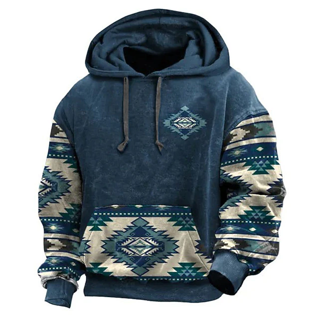 Highlights [Fabric]: Crafted from a soft and durable polyester blend, this hoodie provides both comfort and warmth, making it an ideal choice for the transitional seasons of spring and fall. The micro-elastic fabric ensures a comfortable fit that moves with you. [Fit]: Designed with a regular fit, this hoodie features a classic hooded neckline and a drawstring closure. The long sleeves and cuffed wrists provide added warmth and a snug fit, essential for casual days out. [Design Highlights]: Showcasing a vibrant and unique Aztec-inspired graphic print, this hoodie blends traditional tribal patterns with a modern, stylish twist. Detailed geometric patterns adorn the sleeves and front pocket in shades of blue, green, and beige, offering a cultural and distinctive look. [Occasions]: Perfect for various occasions such as holidays, casual outings, and streetwear, this hoodie suits those who appreciate ethnic and vintage retro styles. Whether you're going out or just enjoying a relaxed day, it adds an element of flair and individuality. [Size Range]: Available in a broad range of sizes from S to 3XL, this hoodie caters to adults looking for a versatile and stylish addition to their wardrobe.