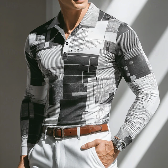 sought-after ! Men's Geometic Polo Long Sleeve Polo Shirts Lapel Casual Outdoor Street Athleisure Daily Wear 3D Print Buttons Spring Fall Winter Black Purple Gray