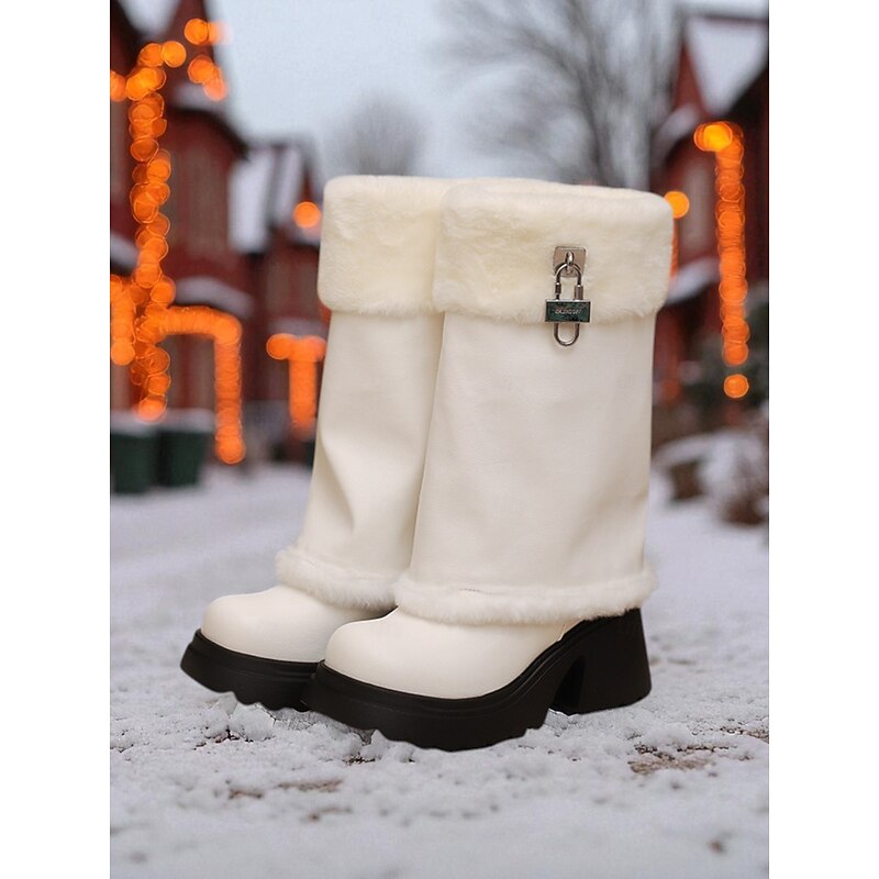 HOT ! Women's Faux Leather Knee High Winter Boots with Faux Fur Trim and Block Heel - Warm Fashion Snow Boots for Ladies, Casual Streetwear, Outdoor & Holiday Outfits