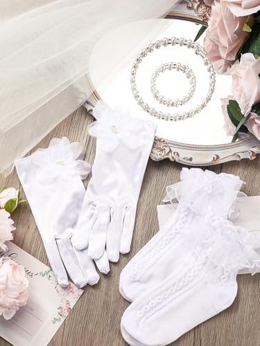 • First Communion Set: this package includes six pieces for a girl's first communion: a veil, satin gloves, lace socks, a pearl bracelet, pearl earrings, and a necklace; Crafted from materials like plastic, polyester, and cotton, these accessories serve as an all in one solution requiring no additional purchases for the holy communion ceremony