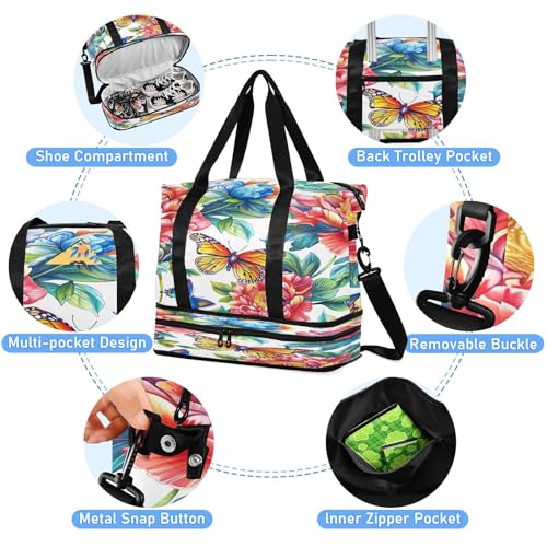 HOT ! Vibrant Floral Pattern Gym Bag for Women Sport Travel Duffel Bag Shoulder Weekender Overnight Bags with Wet Pocket & Shoe Compartment