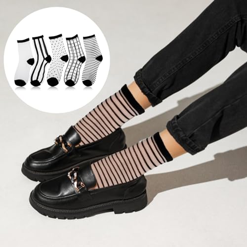 Fabric type: Acrylic fiberCare instructions: Machine WashOrigin: ImportedPattern: Geometric【Chic Design】The black and white spliced sheer socks are designed with stripes, plaids and polka dots, sheer ankle socks are sexy, fashionable, cute and interesting.【Quality Material】Sheer socks women fashion are made of high-quality acrylic, which is plush and breathable, does not fade or snag, is wear-resistant and slightly elastic.【Size Inforamtion】The size of black sheer socks is approximately 30cm/11.81in x 8cm/3.14in, suitable for feet with a length of 22-25.5cm/8.66-10.04in. It is not easy to fall off.【Package Includes】You will receive 5 pairs of sheer black socks with different patterns, including polka dot socks, plaid socks, vertical striped ankle socks, horizontal striped socks women and solid color socks.【Wide Applications】Womens sheer socks can be paired with skirts, dresses, and shorts. Sneakers, sandals, slippers, etc., suitable for dates, dances, daily wear, etc.Casual and versatile. Perfect for everyday use. first-class materials and excellent craftsmanship ensure long-lasting durability.