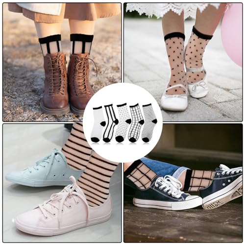Lusofie 5Pairs Sheer Ankle Socks Black See Through Socks Striped Plaid Dot Cute Transparent Socks for Women Girls