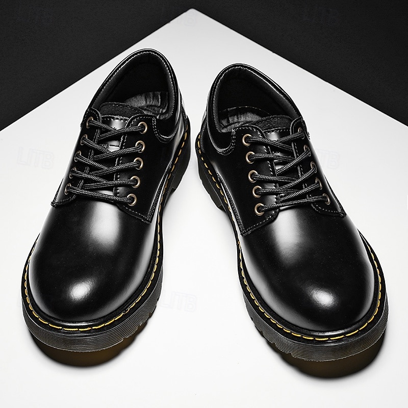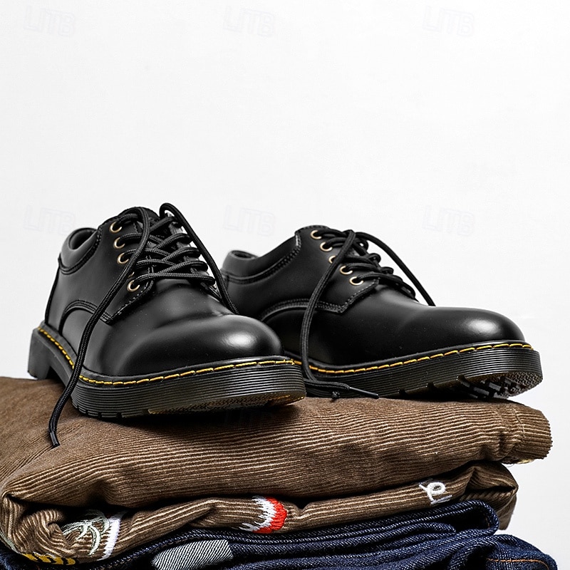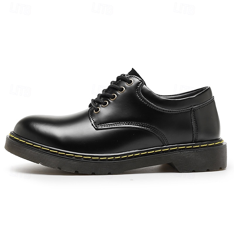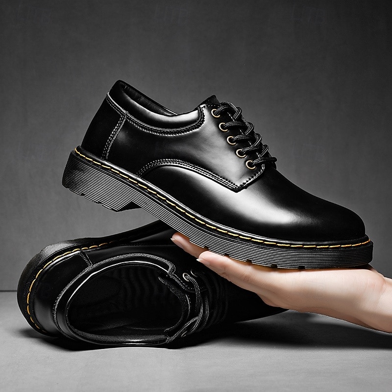 HOT ! Men's Black Faux Leather Lace-Up Shoes with Yellow Stitching, Durable Casual Sneakers for Work and Everyday Wear