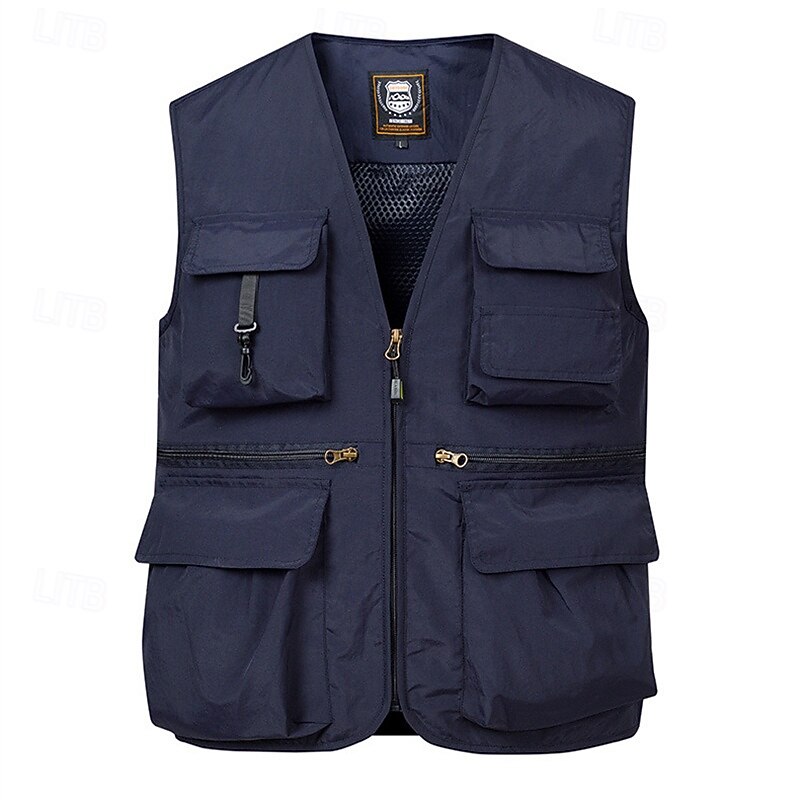 The vest features a classic utilitarian style with a robust zipper front closure and multiple spacious pockets with flap closures, ensuring secure storage of essential items. Available in a range of earthy and vibrant colors, including Black, Royal Blue, Orange, Red, Navy Blue, Army Green, and Khaki, it suits various personal styles and preferences.