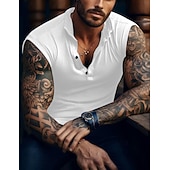 Highlights [Fabric:] Crafted from a soft and breathable cotton blend, this men's sleeveless shirt offers comfort and ease for all-day wear. The high-quality fabric ensures durability and flexibility, making it perfect for various activities. [Fit:] This tank top features a slim fit that accentuates the body’s natural shape, providing a flattering silhouette for a stylish and polished look. [Design Highlights:] The shirt boasts a unique Henley neckline, combining the classic button-down collar style with a modern V-neck twist. The dark buttons contrast subtly against the pure white fabric, adding a touch of sophistication to its plain or striped pattern options. [Occasions:] Ideal for summer outings, this versatile piece is perfect for outdoor activities, casual gatherings, and gym sessions. Pair it with a blazer for a smart-casual ensemble, making it suitable for various events and outings. [Size Range:] Available in a wide range of sizes from S to 3XL, ensuring a perfect fit for different body types and preferences.