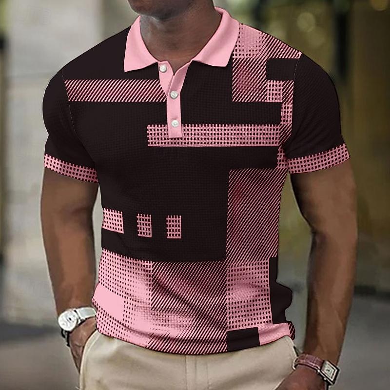Men's Plaid Waffle Polo Shirts Golf Shirt Short Sleeve Polo Shirts Collared Shirts Vintage Casual Vacation Wear Formal Wear Festival Wear 3D Print Buttons Light Yellow Light Pink Black-White 55