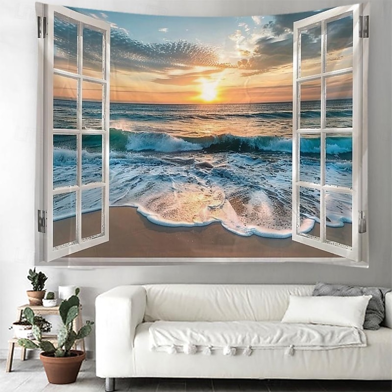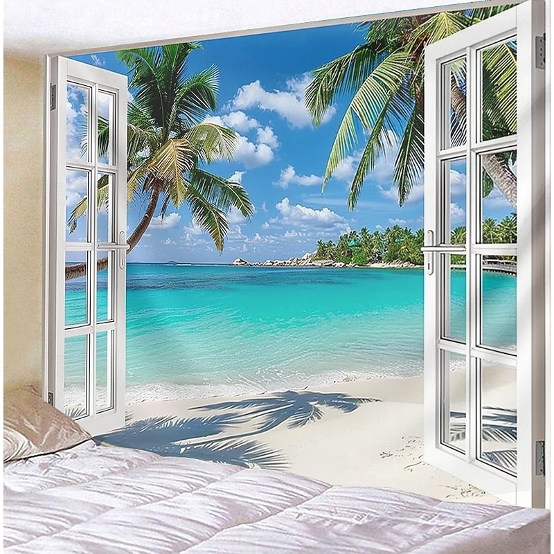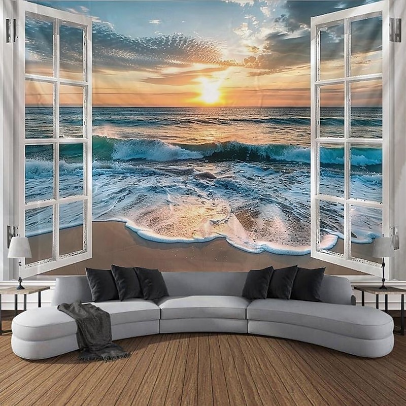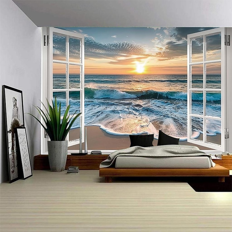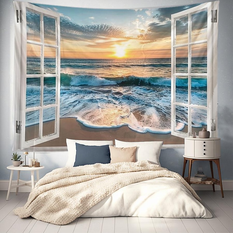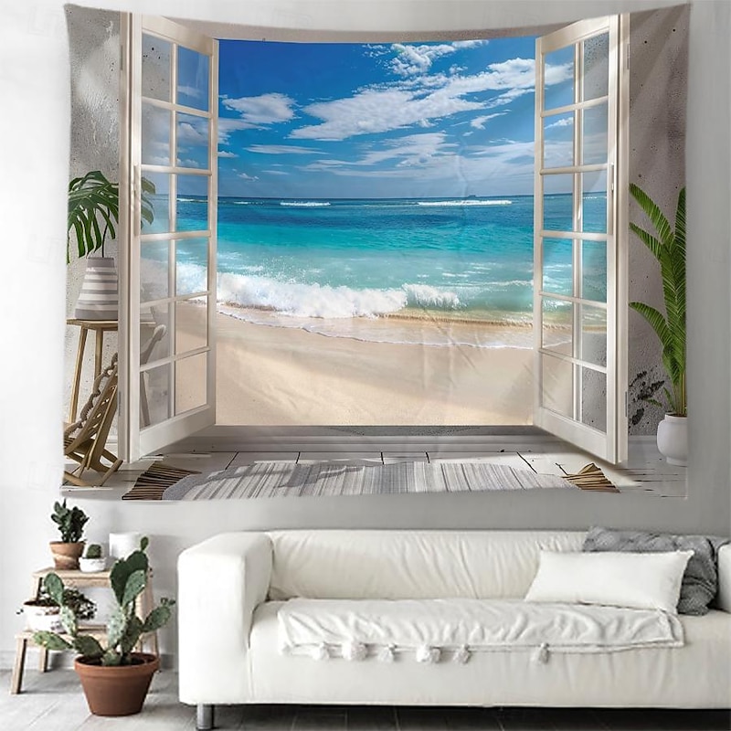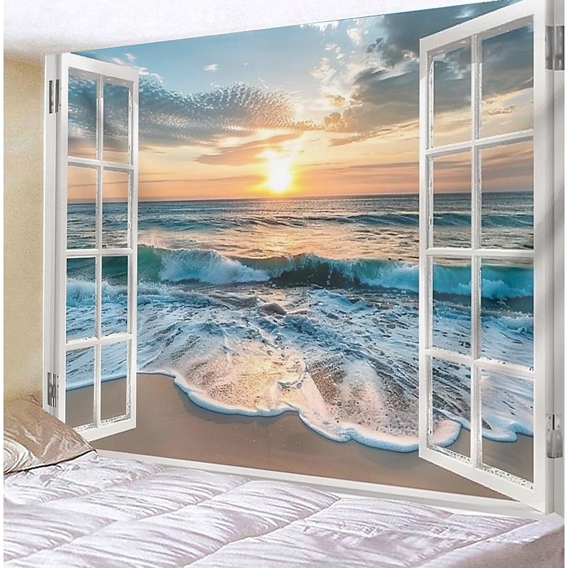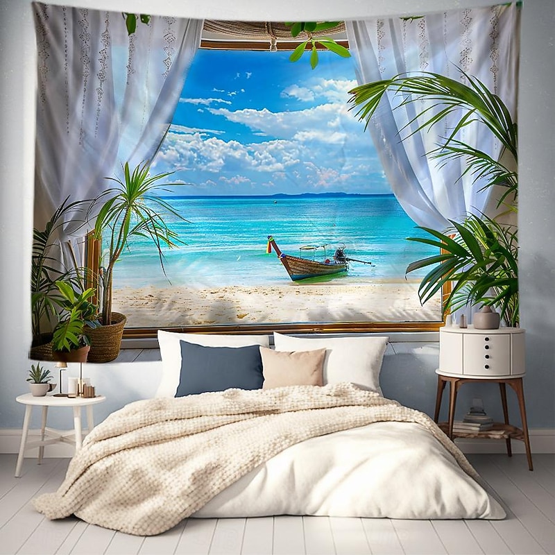 HOT ! Window Ocean Boat Hanging Tapestry Wall Art Large Tapestry Mural Decor Photograph Backdrop Blanket Curtain Home Bedroom Living Room Decoration