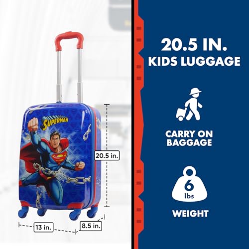 • SUPERMAN LUGGAGE: This sleek and stylish hard-shell suitcase showcases Superman in action, with bright red accents for a dynamic look that stands out at the airport or during travel, with dual zippers to keep your valuables safe and secure inside; 20.5 inch hard side luggage meets most airline requirements for carry-on luggage and fits into most overhead bins
