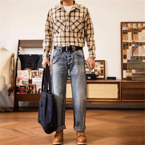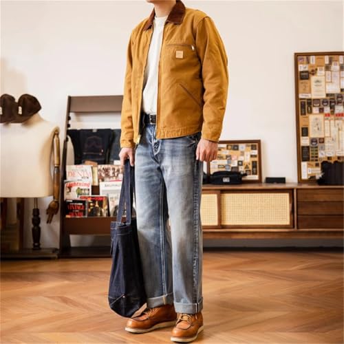 Men’S Vintage Loose Fit Straight Selvedge Cotton Full Length Jeans Zipper Fly Midweight Wash Casual Wear Pants