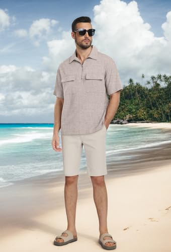 Lepunuo Mens Zipper Polo Shirts Linen Casual Short Sleeve Shirts Loose Fit T Shirts with Cargo Pockets 4