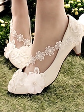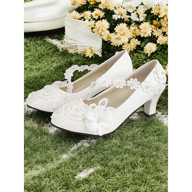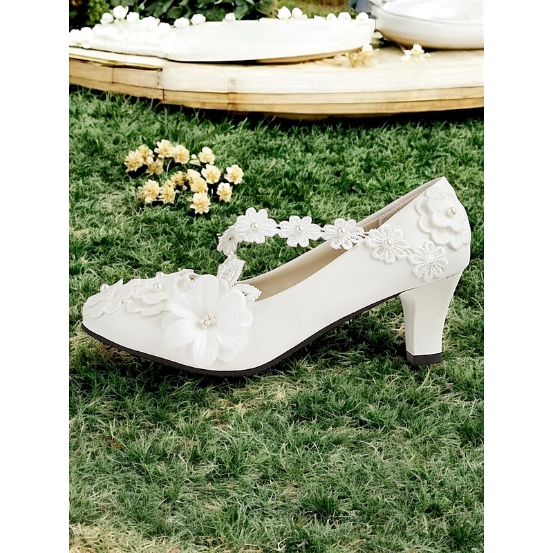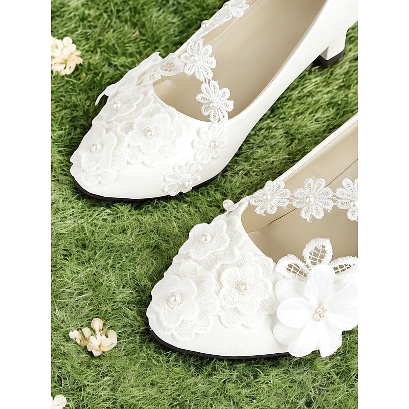 Highlights [Fabric] : Crafted from a luxurious PU for the upper material and lined with synthetic leather, these bridal shoes exude sophistication with their delicate cream or ivory hue. The combination of high-quality materials ensures durability and comfort throughout your special day. [Silhouette] : With a classic rounded-toe design and a modest kitten heel, these shoes offer a perfect balance of comfort and style, making them ideal for prolonged wear without the sacrifice of elegance. [Design Highlights] : The shoes are adorned with intricate floral lace appliqués that grace the upper, each flower beautifully accented by a small pearl at its center for added femininity and timeless elegance. The striking details provide a romantic and vintage-inspired aesthetic that is sure to complement any bridal ensemble. [Occasions] : Designed especially for weddings and other special occasions, these shoes are perfect for adding a charming and graceful touch to your outfit. Whether it's walking down the aisle or dancing the night away, these heels will enhance the beauty of your look. [Size Notice] : Available in a range of sizes from US5.5 to US10, these shoes come in standard sizes, so selecting your usual size is recommended for the best fit.