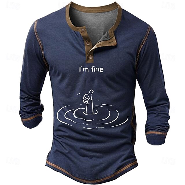 Men's Long Sleeve Henley Shirt with Funny 'I'm Fine' Drowning Graphic. Ironic Lifestyle Humor. 9
