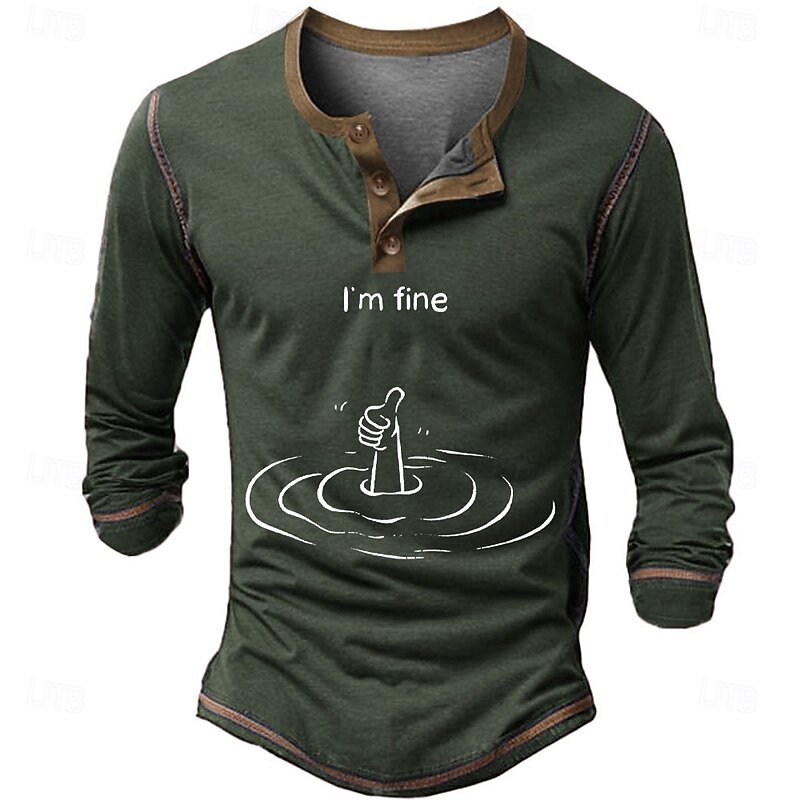 Men's Long Sleeve Henley Shirt with Funny 'I'm Fine' Drowning Graphic. Ironic Lifestyle Humor. 1