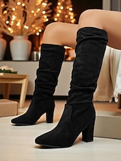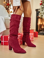 More information about Women's Red Suede Slouch Knee High Boots with Block Heels, Chic Winter Fashion Footwear for Christmas Parties, Holiday Outfits & Daily Wear