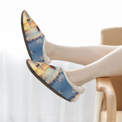 HOT ! Sunset Lighthouse House Slippers for Women Men, Sea Seagull Fuzzy Soft Cozy Non Slip Slipper Socks